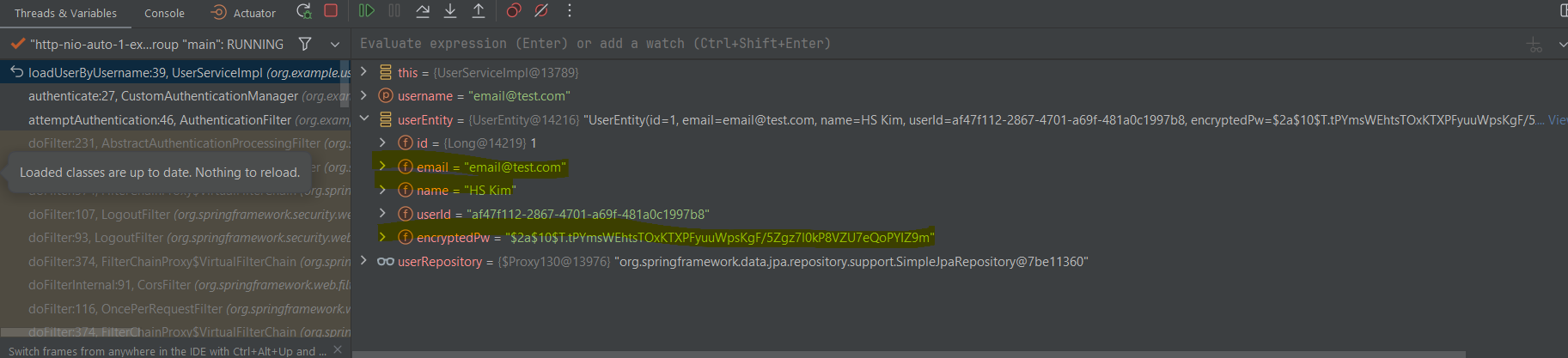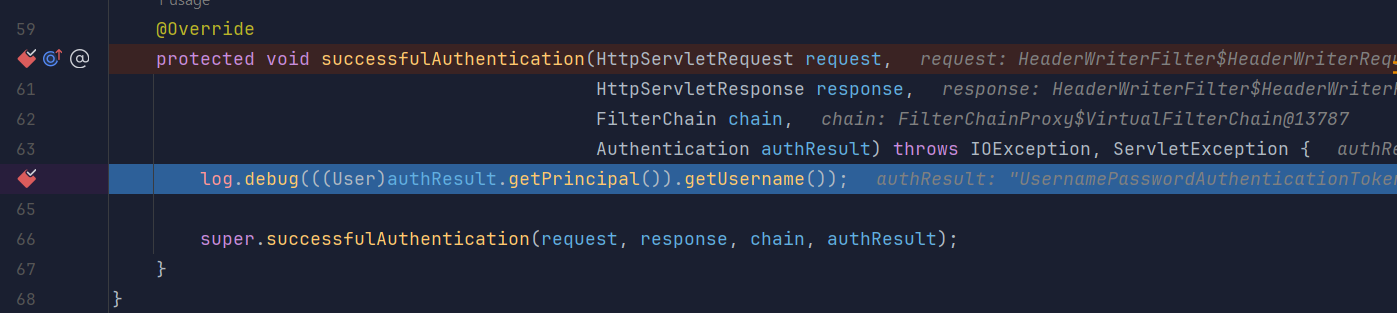 attemptAuthentication, successfulAuthentication, loadUserByUsername 과 같이 인증 처리 과정에서 어떤 메서드들이 순서대로 호출되는지 디버거를 통해서 확인이 가능합니다.