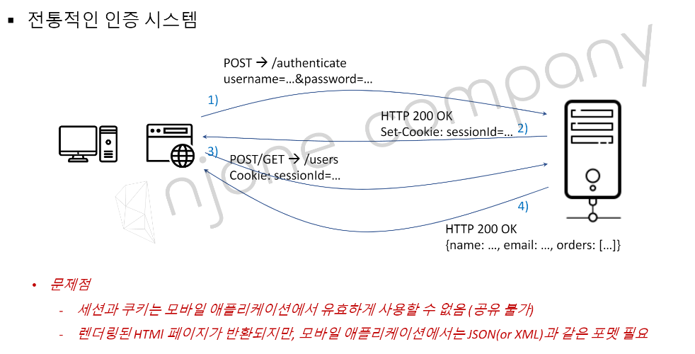 위 그림은 기존에 session과 cookie를 사용하여 인증/인가 방식을 구현한 것입니다.
