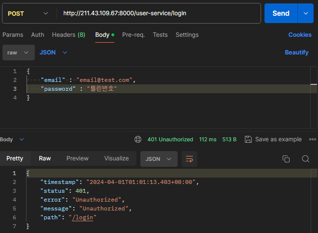 위처럼 401 응답 상태 코드가 반환 및 오류 메시지가 출력된 것을 확인할 수 있습니다.
