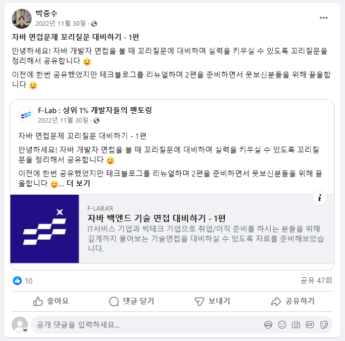 전 생활코딩 페이스북 페이지를 즐겨봅니다. 여느때처럼 퇴근길에 커뮤니티를 보던 중, F-Lab 대표님이신 핏츠님의 글을 봤습니다.