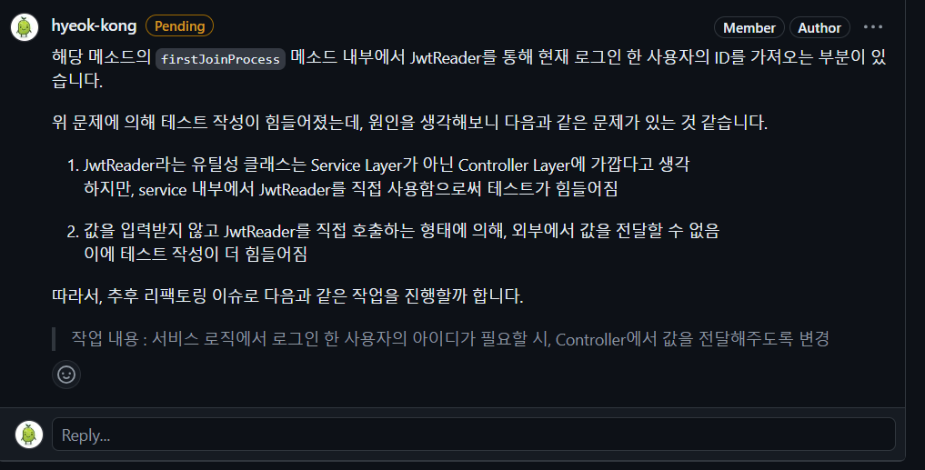 멘토링을 진행하며, 언제부터인가 생각하는 방식이 바뀌었던 것 같아요. 같은 기능을 구현해도 JWT를 읽어 로그인 정보를 받아오는 메소드를 서비스 클래스에서 사용하는 게 맞을까? 와 같이, 이전보다 더 구체적이고 깊이 있는 고민을 할 수 있게 된 것 같습니다.