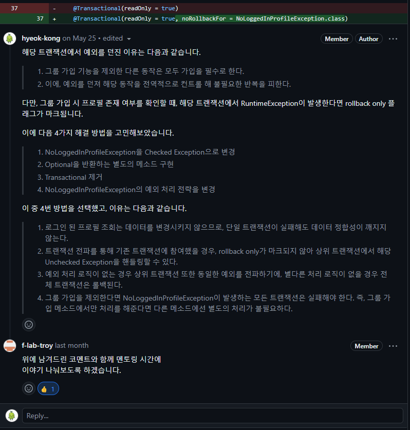 이 문제에 대해서 멘토님은 일관성 있는 트랜잭션 처리, 즉 2번의 별도의 메소드를 구현하는 방법이 더 좋을 것 같다 라는 의견을 남겨주셨지만, 멘토님의 생각을 강요하진 않으셨어요.