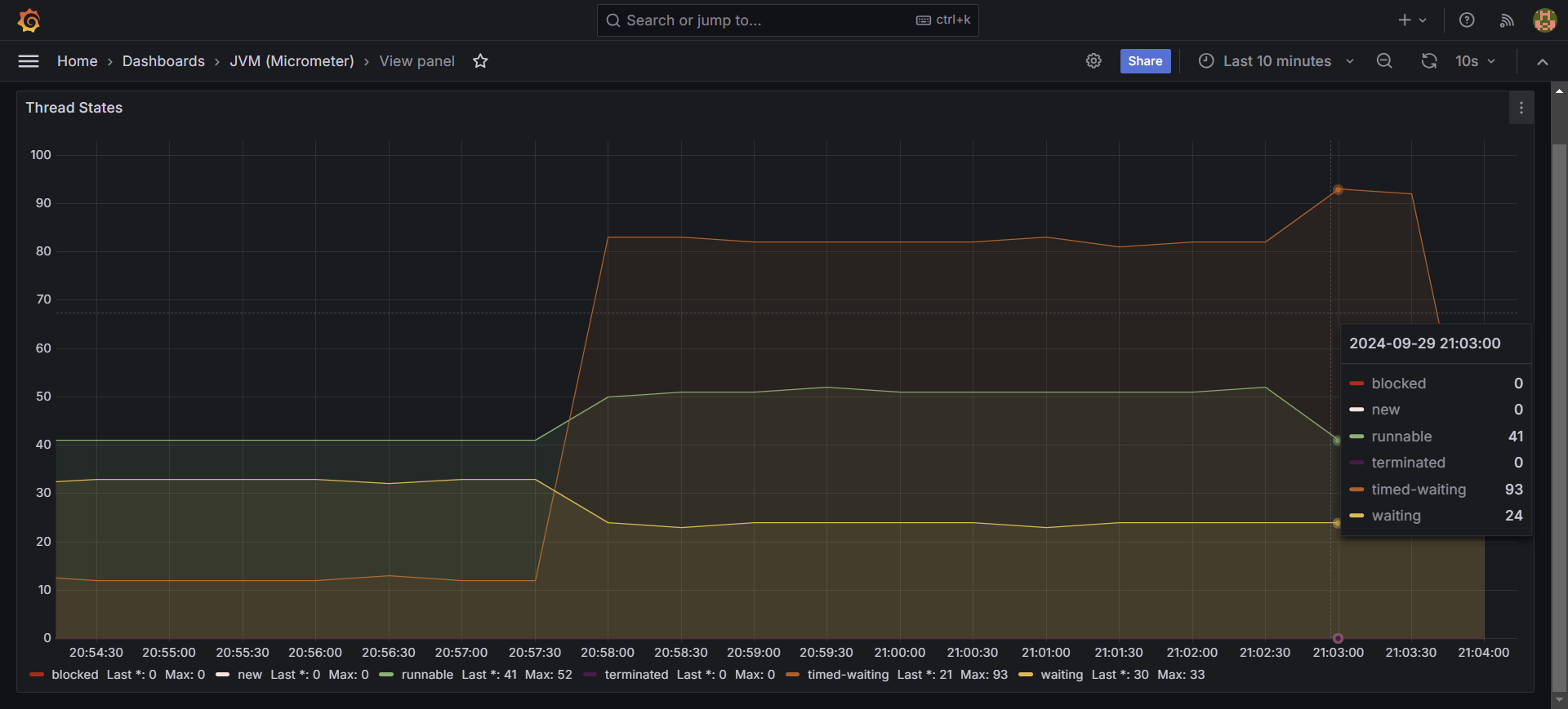 두 요청의 스레드 상태 변화를 관측했더니 굉장히 유사한 모습을 보여줍니다. 다만 성능은 89배 차이라는 점..!