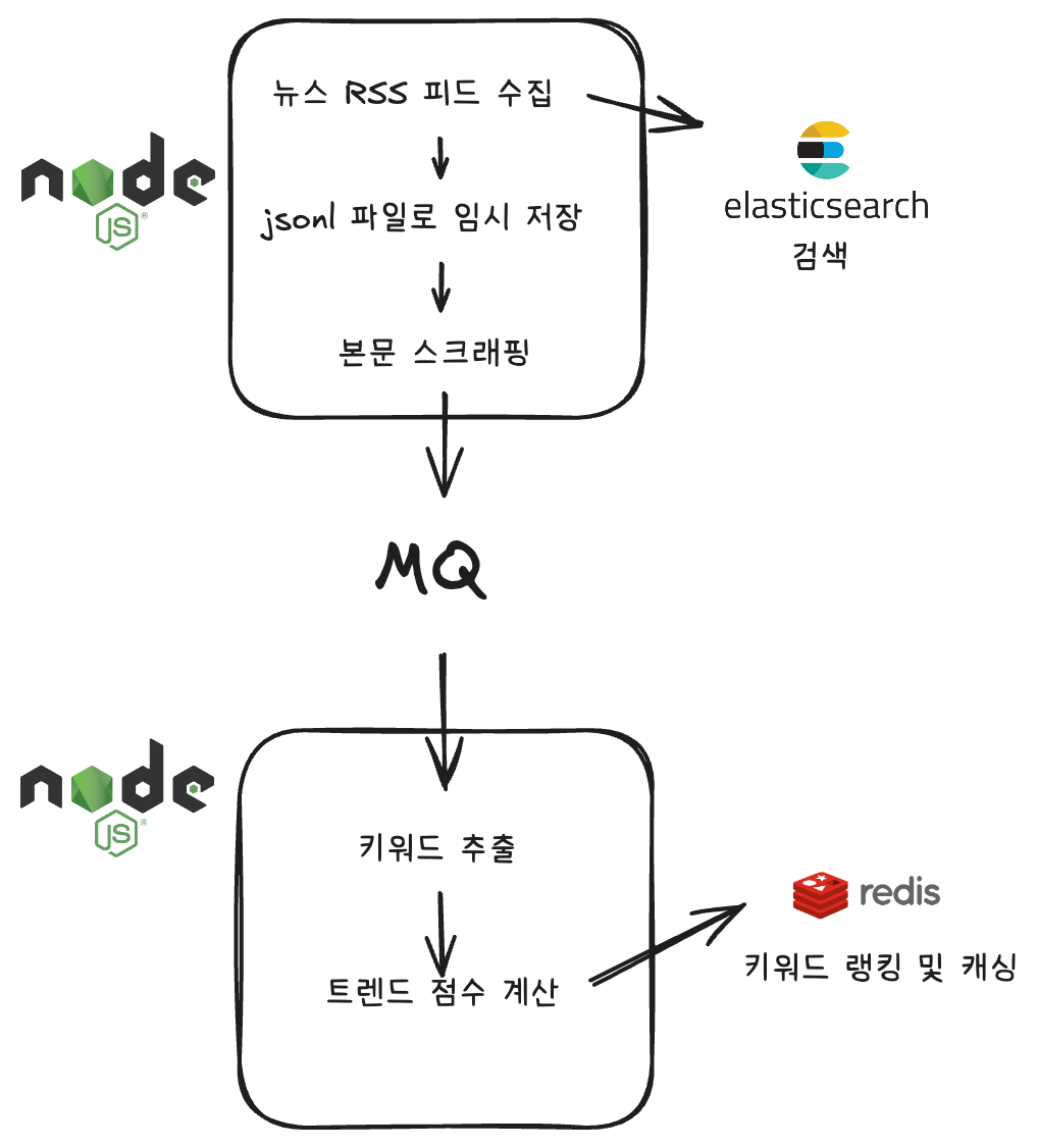 기사 1건 = RSS 수집 → 본문 스크래핑 → Elasticsearch 인덱싱 → 트렌드 점수 계산