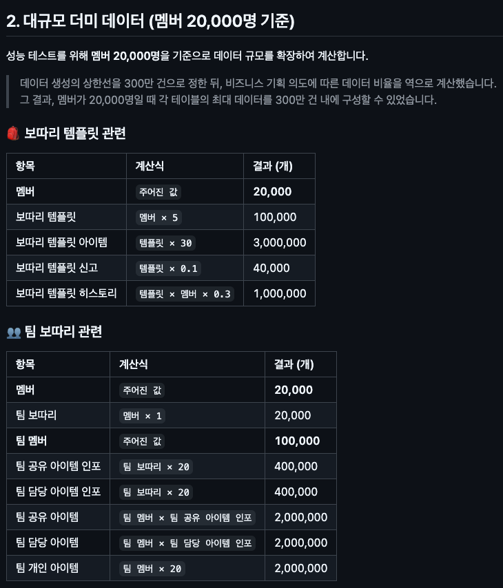 더미 데이터는 양적인 측면뿐만 아니라 질적인 측면도 고려하여, 실제 운영 환경과 유사한 부하를 발생시키도록 구성했어요. (기간은 3년으로 설정)