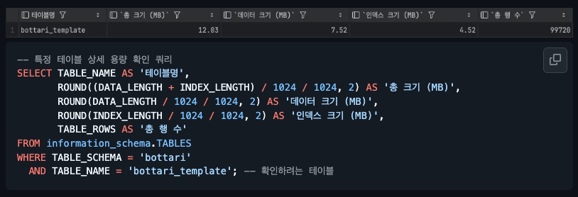 인덱스 용량 확인으로 공간적 부담을 확인해보기도 했어요.