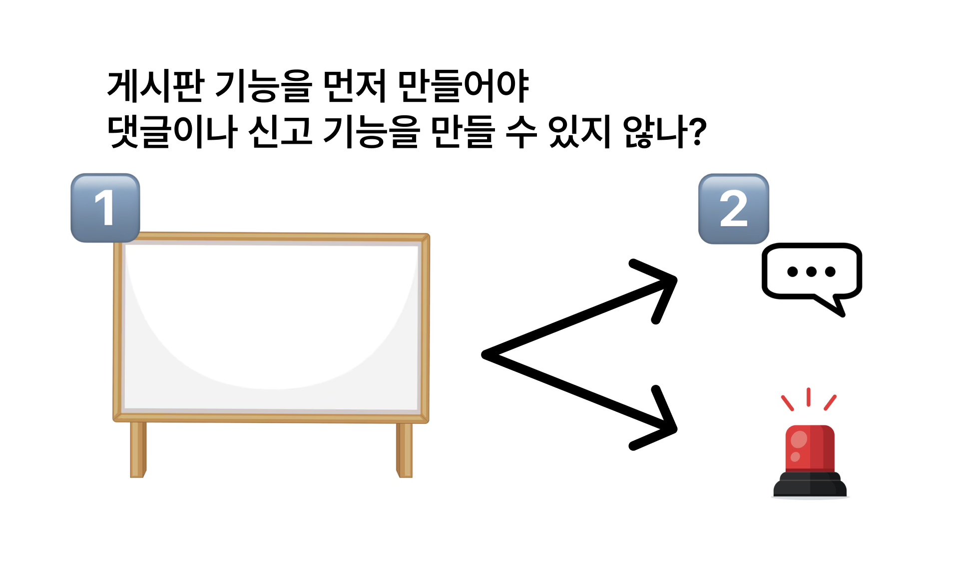 예를 들어, 게시판 기능(A)이 완전히 완성되어야만 댓글이나 신고 기능(B)을 개발할 수 있다고 생각했다. 만약 두 짝이 A와 B를 동시에 작업하다 나중에 합칠 때 코드가 엉키거나 충돌이 나면, 그걸 해결하는 데 시간을 뺏겨 오히려 더 비효율적일 거라고 예상했기 때문이다.