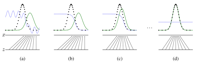 - (c): θg가 update 되어 z의 분포는 조금씩 왼쪽으로 이동한다.