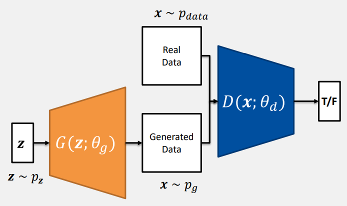 Goal: data의 분포를 capturing 할 수 있고 D(G(z))=True가 되도록 학습한다.