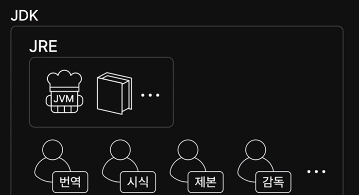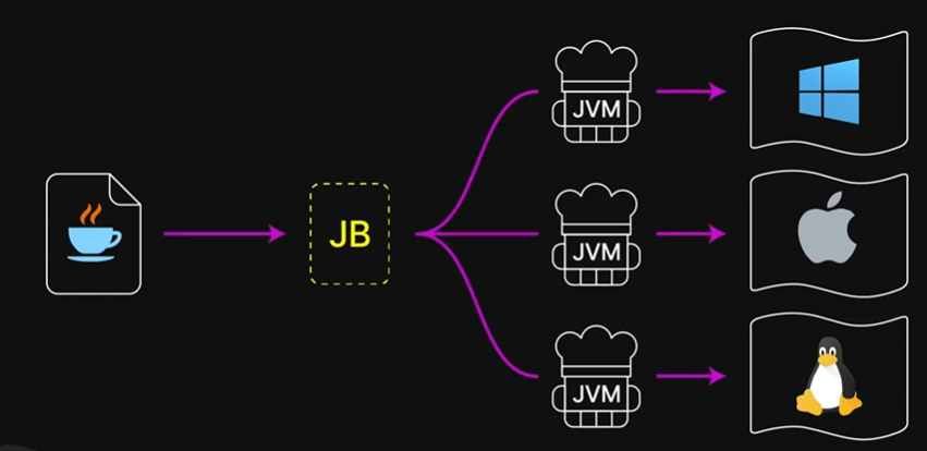 레시피를 자바 바이트코드(JB)로 번역해서 각국에 보내면, JVM이라는 주방장들이 이 공통 번역본을 읽고 파견된 국가의 직원들, 즉 컴퓨터 자원들에게 현지어로 지시를 내리게 된다.