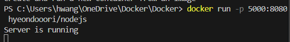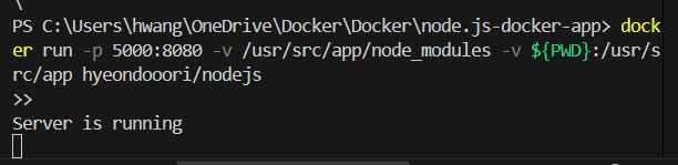 -p 5000:8080: 호스트의 5000번 포트를 컨테이너의 8080포트에 매핑한다.-v /usr/src/app/node_modules: node_modules 폴더를 호스트에 공유하지 않고, 컨테이너 내부에만 유지시킨다. -v $(pwd):/usr/src/app: 현재 작업 디렉토리($(pwd))를 /usr/src/app경로에 매핑하여 소스 코드 파일이 컨테이너와 동기화되도록 한다.