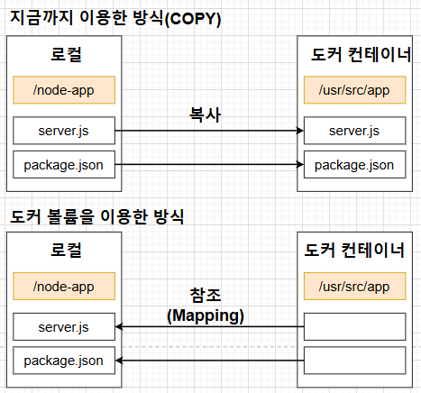 COPY는 호스트 디렉터리에 있는 파일을 도커 컨테이너네 복사하는 것이고, 볼륨은 도커 컨테이너에서 호스트 디렉터리에 있는 파일들을 매핑해서 사용한다.
