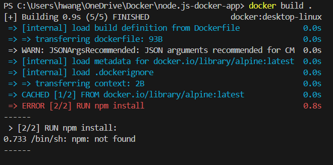 이제, 만들어둔 Dockerfile을 docker build .으로 실행시켜보면 오류가 나는 것을 확인할 수 있다.