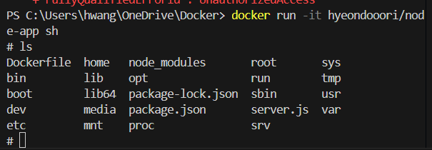 처음 ls를 실행한 결과에 COPY된 것들만 존재한다. 그 이유는 WORKDIR을 지정하면 root가 아니라 WORKDIR로 가게 되기 때문이다. 따라서 처음 ls실행환경이 WORKDIR로 지정했던 /usr/src/app인 것이다.