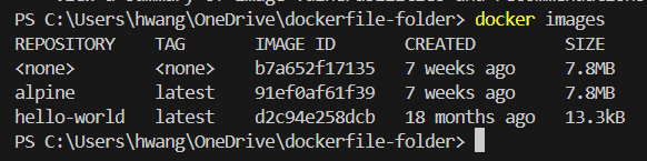 FROM alpine 명령에 따라, alpine이미지를 기반으로 사용한다. 여기서는 Docker가 최신 버전(apline:latest)의 메타데이터를 가져온다.