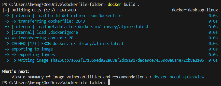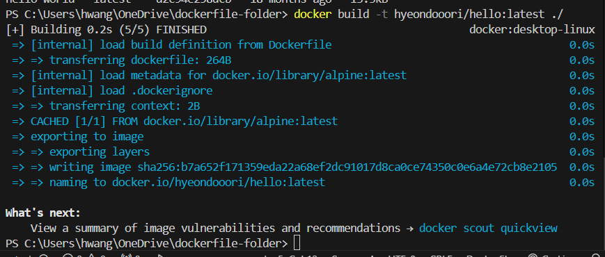 빌드가 완료된 이미지를 저장하고, 이미지의 해시 값을 출력한다. 이 해시값은 이미지의 고유ID이다.
