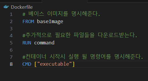 도커 이미지를 만들기 위한 설정 파일이므로, 도커 이미지가 필요한 것이 무엇인지를 생각해야한다. 도커 이미지는 시작 시 실행 될 명령어와 파일 스냅샷으로 구성되어있으므로, 이 두 가지를 만들어야 한다.