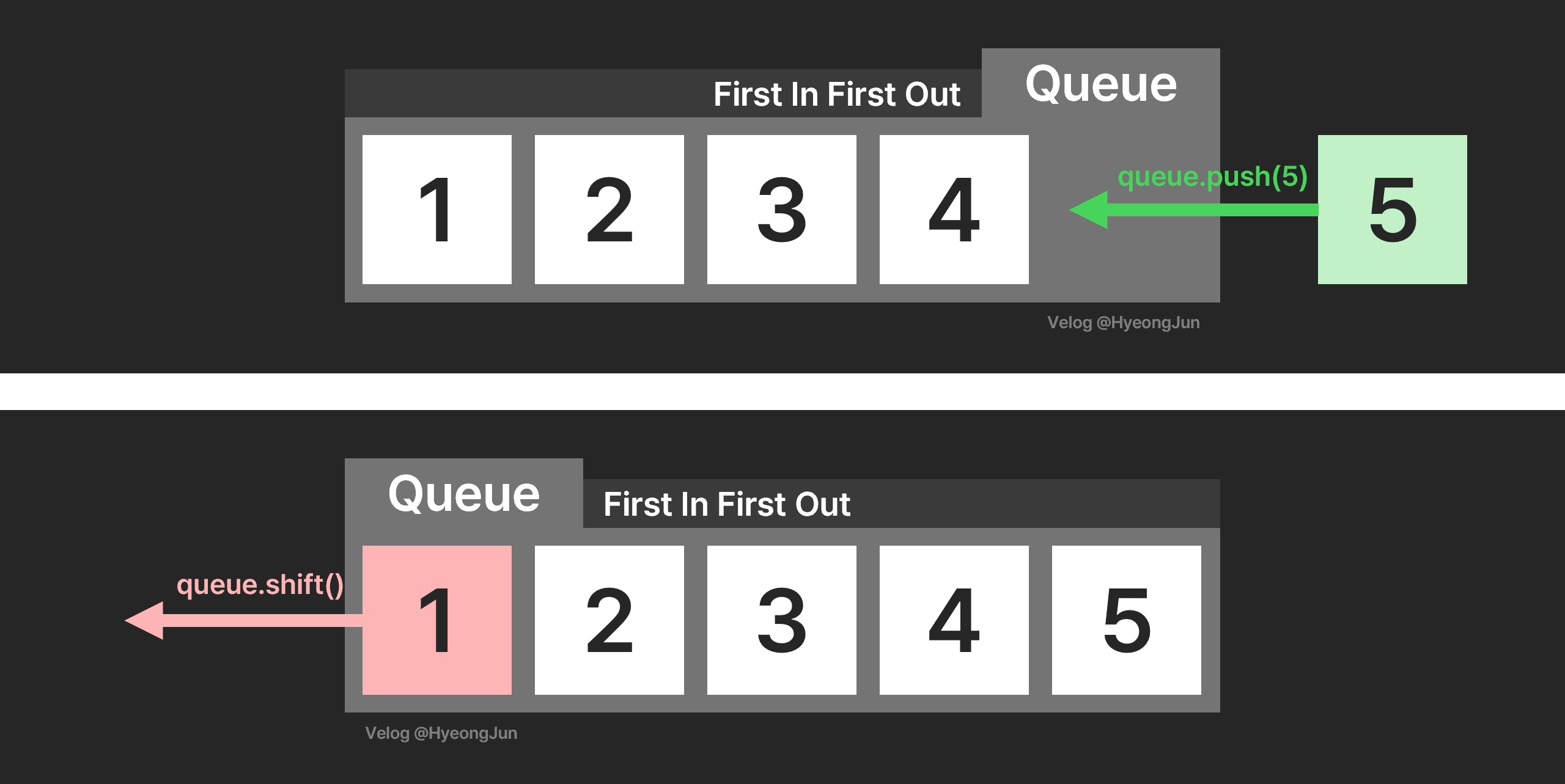 queue.push(5); // [1, 2, 3, 4, 5]