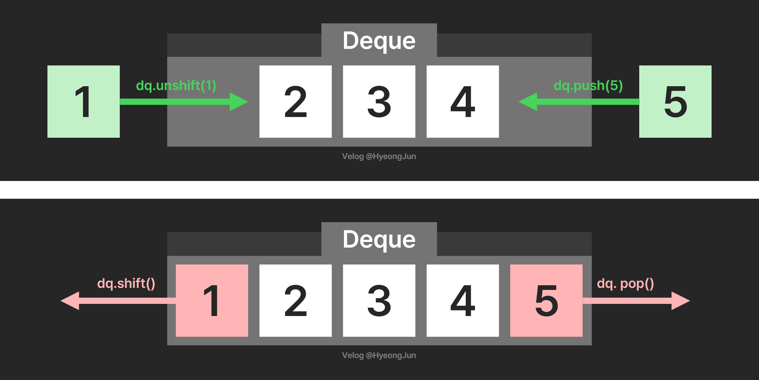 dq.unshift(1); // [1, 2, 3, 4]