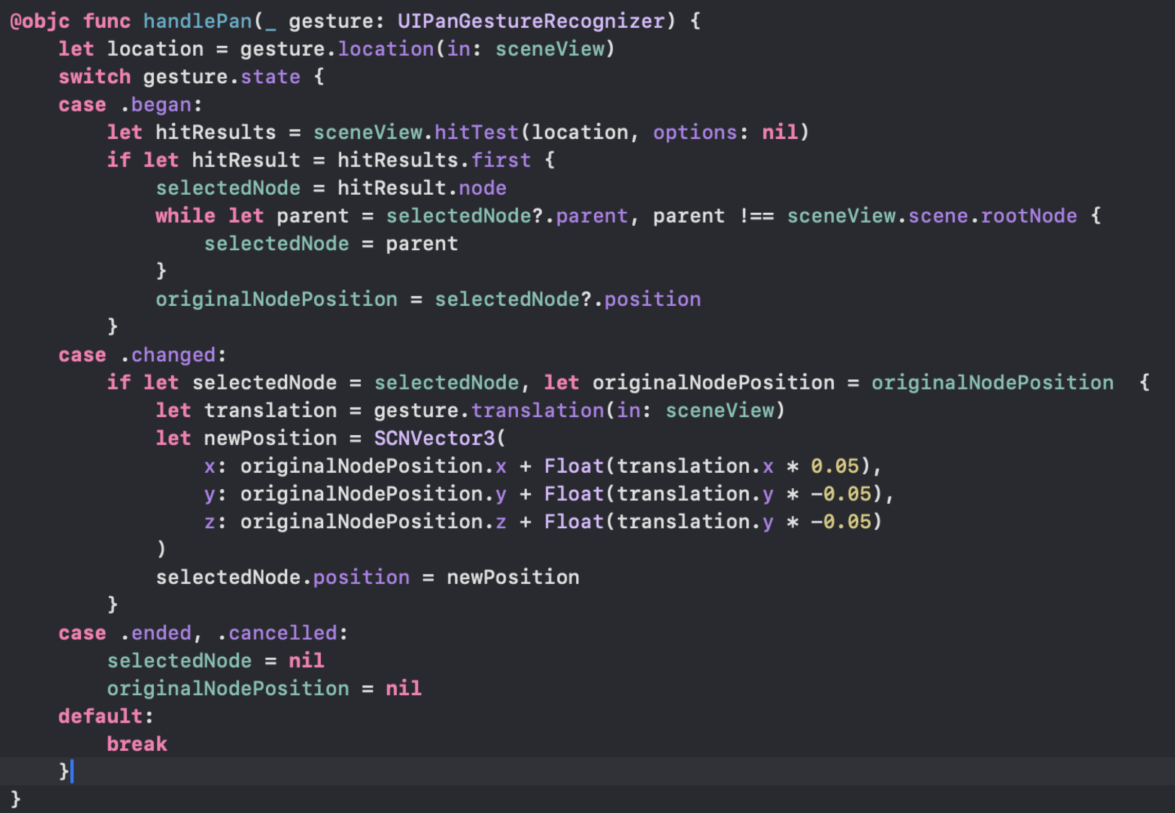두번째 제스쳐인 팬 제스쳐 코드입니다. 마찬가지로 최상단 노드를 찾아 selectedNode로 설정하는 것은 같으나 오브젝트 전체를 드래그 즉 팬제스쳐를 통해 이동시키기 위해서는 최상단 노드를 찾는것으로 충분하기 때문에 추가로 자식노드를 찾는과정은 없습니다. 최상단 노드 , 즉 컨트롤 하기위해 필요한 노드를 찾았다면 팬제스쳐가 시작될때의 위치를 originalNodePosition 변수에서 저장해두었다가, 팬제스쳐가 실행, 즉 changed될때 sceneView에서 제스쳐가 변화된 만큼을 originalNodePosition기준으로 적절하게 계산하여 새로운 위치로 조정해줍니다. 여기서는 0.05를 곱하였고 z 축의 경우에는 따로 2D 좌표계인 제스쳐에서는 계산이 불가하여 적절한 위치로 보이도록 기존 z 축 위치에 y축 변화량을 계산해주는 방식으로 보완하였습니다.