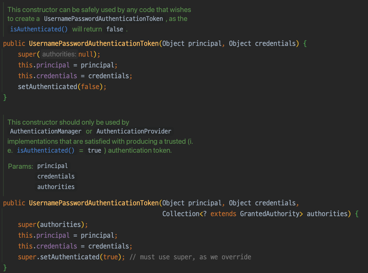 특히 Authentication 구현체 중 하나인 UsernamePasswordAuthenticationToken 를 사용시에는 authorities가 있으면 인증된 것으로 인지하니 사용 시 유의해야 합니다.