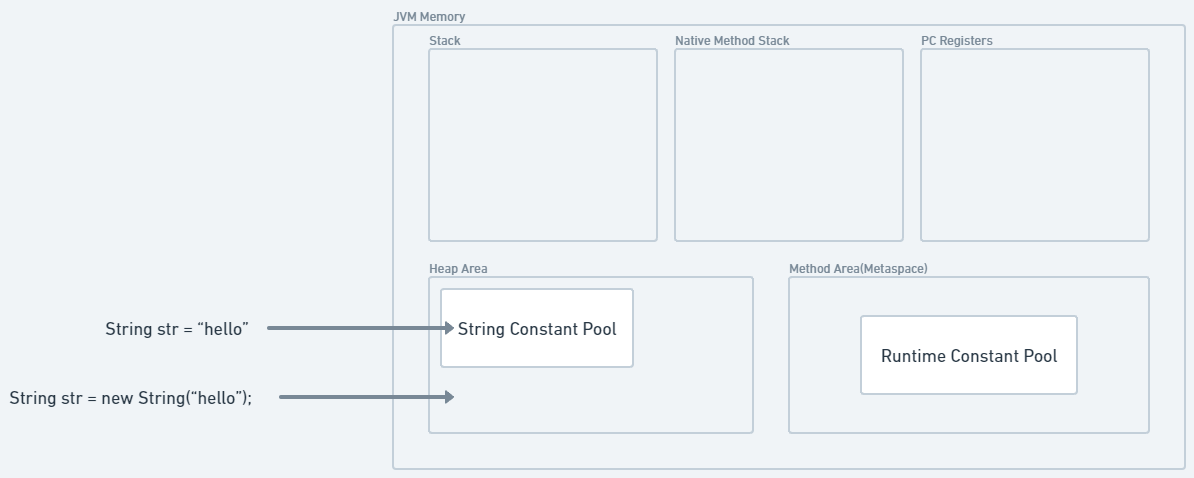 new 키워드로 생성된 문자열 = 객체 -> Heap 메모리따라서 new String("Hello")는 사실상 두 개의 객체를 생성