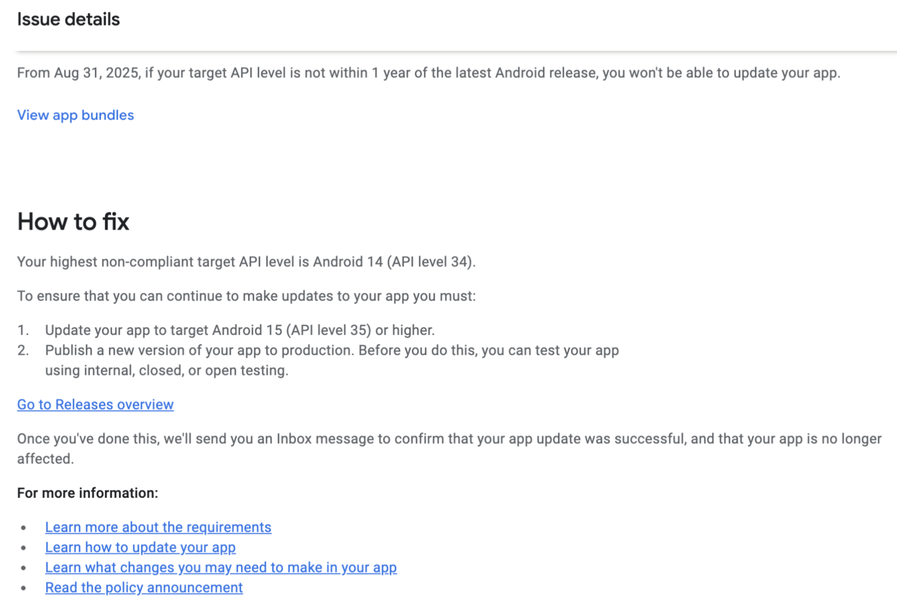 최근 Google Play Console에서 8월 31일까지 SDK를 35로 올려야 한다는 안내를 받았다.