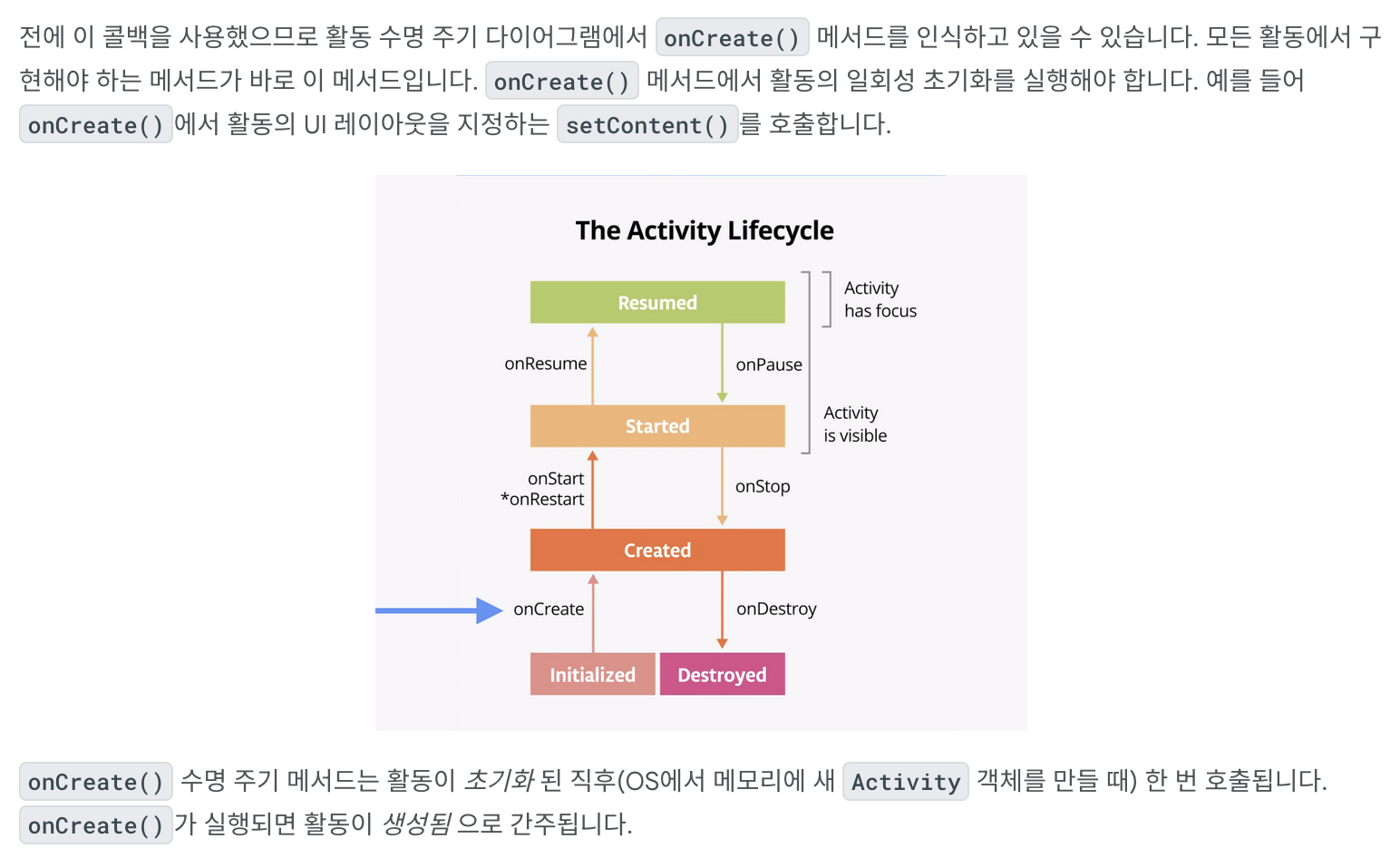는 Android Activity 생명주기 내에서 딱 한 번만 실행되는 함수로,MainActivity.kt
