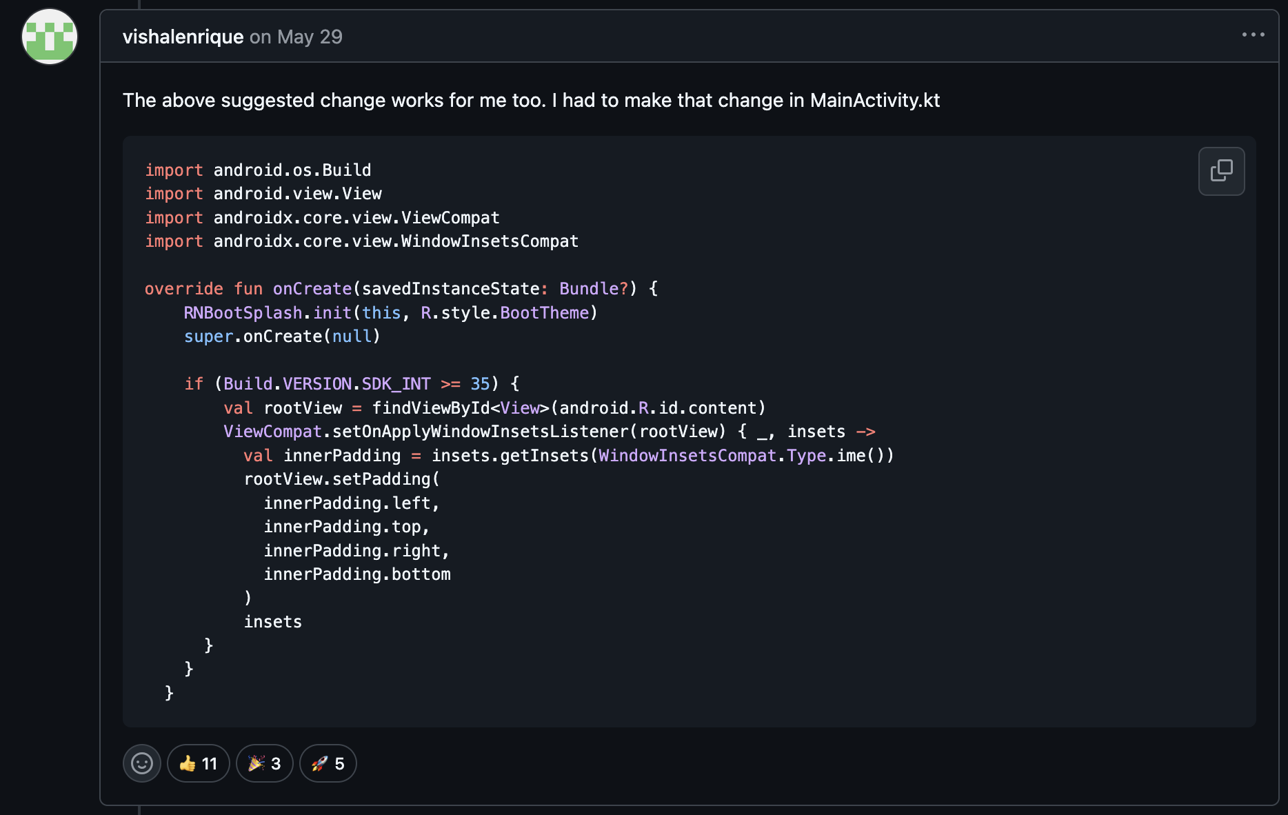 Expo SDK 53/Android SDK 35로 업데이트한 뒤 안드로이드에서만 키보드가 화면을 가리는 문제가 발생하신다면, 이 포스트가 도움이 되었기를 바랍니다.