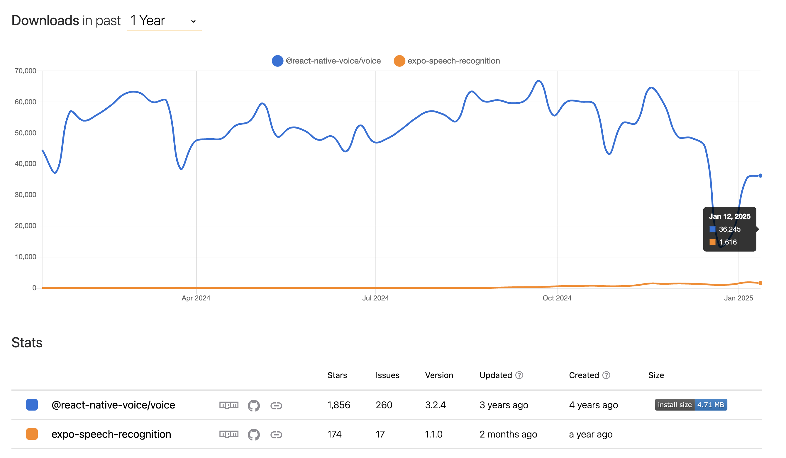 그러던 도중 한 개발자의 댓글을 통해 expo-speech-recognition 라이브러리의 존재를 알게 되었다. 출시된지 1년 된 라이브러리로 사용자 수는 많지 않지만 README가 잘 작성되어 있었기에 한 번 테스트해보자는 마음으로 사용했고, 결과적으로 매우 만족하는 결과를 얻었다.