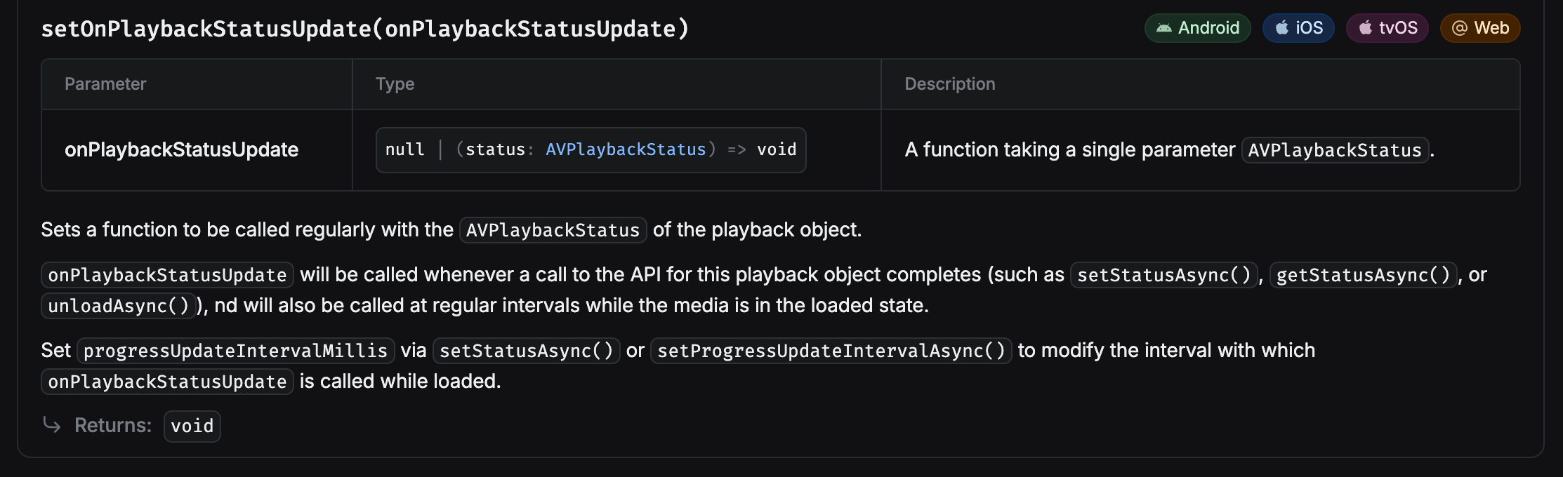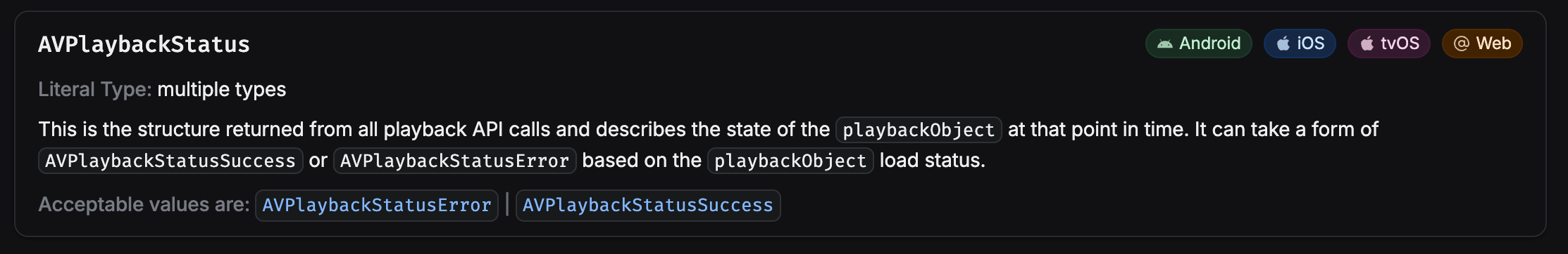 setOnPlaybackStatusUpdate 함수의 콜백 함수 매개변수 타입인 AVPlaybackStatus는 AVPlaybackStatusError와 AVPlaybackStatusSuccess의 유니온으로 구성되어 있다.