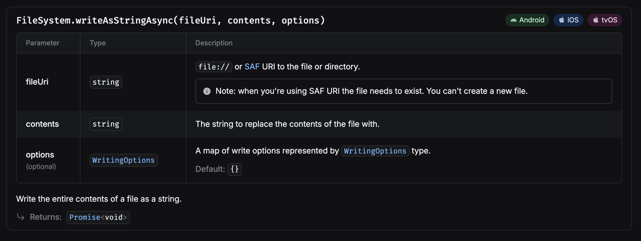 expo-file-system에는 writeAsStringAsync 함수로 파일 쓰기를 수행할 수 있는데, ArrayBuffer 타입은 들어가지 않아 약간 당황했었다. 이 이야기는 아래에서 마저 진행하겠다.