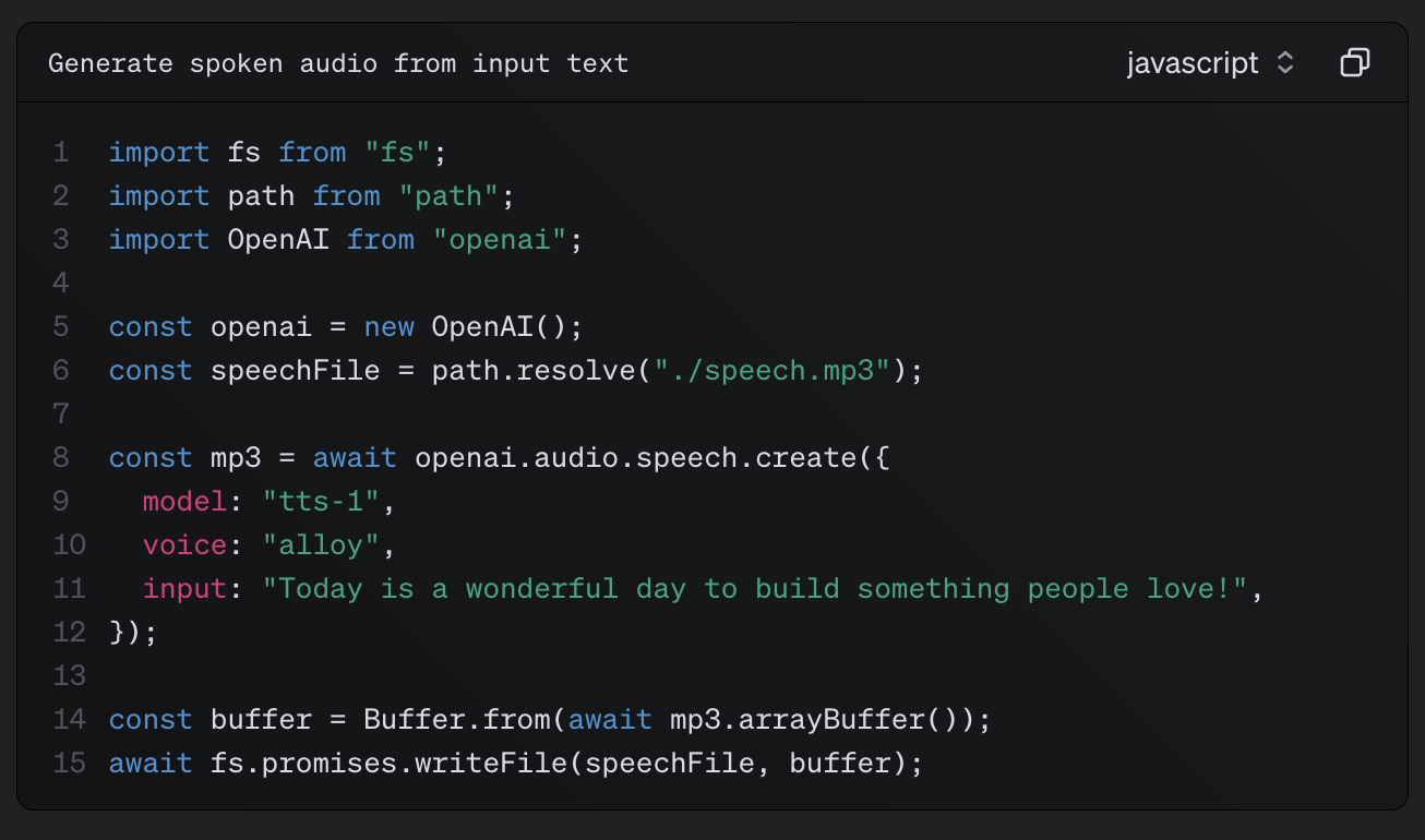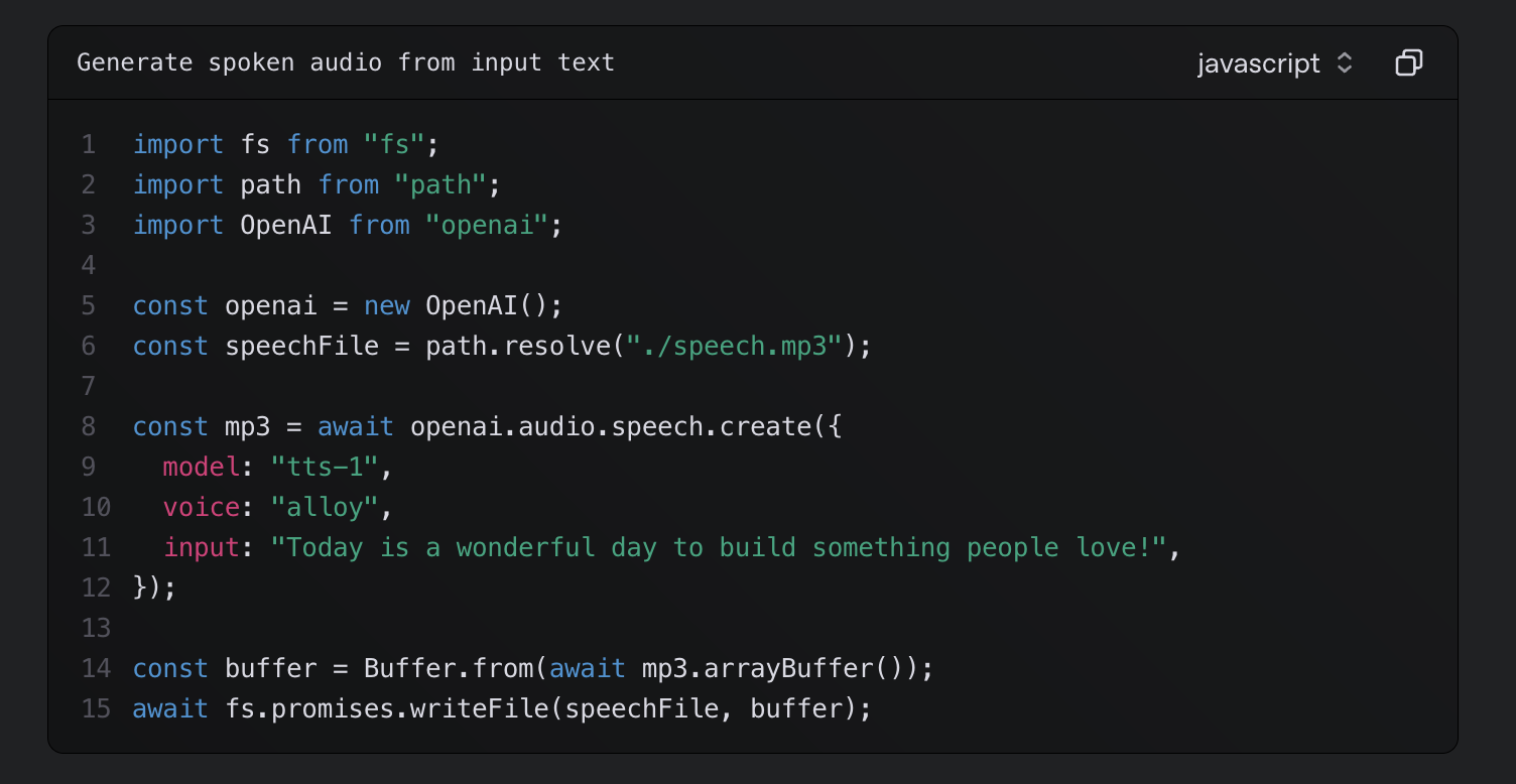 OpenAI 공식 문서를 살펴보면, API의 응답을 arrayBuffer 형식으로 받아와 Buffer로 변환하고 file system을 활용해 파일을 생성해야 한다는 것을 알 수 있다.
