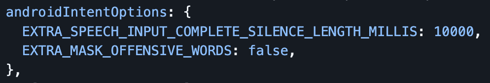 speechend 이벤트가 발생하기까지 걸리는 침묵 시간은 넉넉히 잡기로 했다. 아래와 같이 androidIntentOptions에 EXTRA_SPEECH_INPUT_COMPLETE_SILENCE_LENGTH_MILLIS를 주면 speechend 이벤트 발생까지 걸리는 시간을 조절할 수 있다.