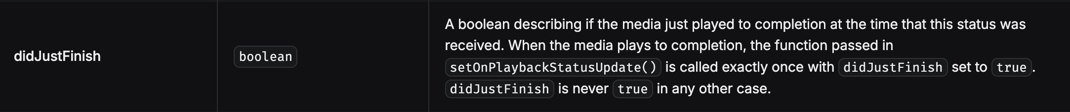 즉, AVPlaybackStatus를 AVPlaybackStatusSuccess로 내로잉한 뒤, didJustFinish에 접근해야만 한다. 이 부분에서 좀 해멨었다. (didJustFinish가 안 떠서 deprecated된 줄 알았다...)