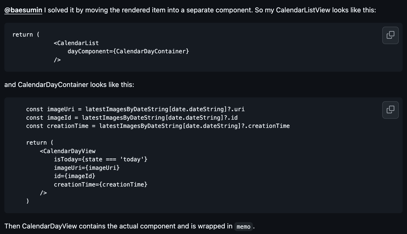작성자는 CalendarDayView 컴포넌트를 return하는 useCallback 함수를 dayComponent props에 전달하도록 구현했더니 CalendarList에서 리렌더링이 발생했다고 한다.