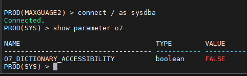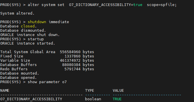 alter system set O7_DICTIONARY_ACCESSIBILITY=false scope=spfile