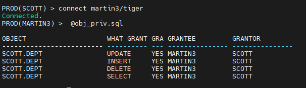 그런데 scott 계정처럼 다른 계정이 만든 테이블을 martin1 이 insert, update, delete 를 하려면