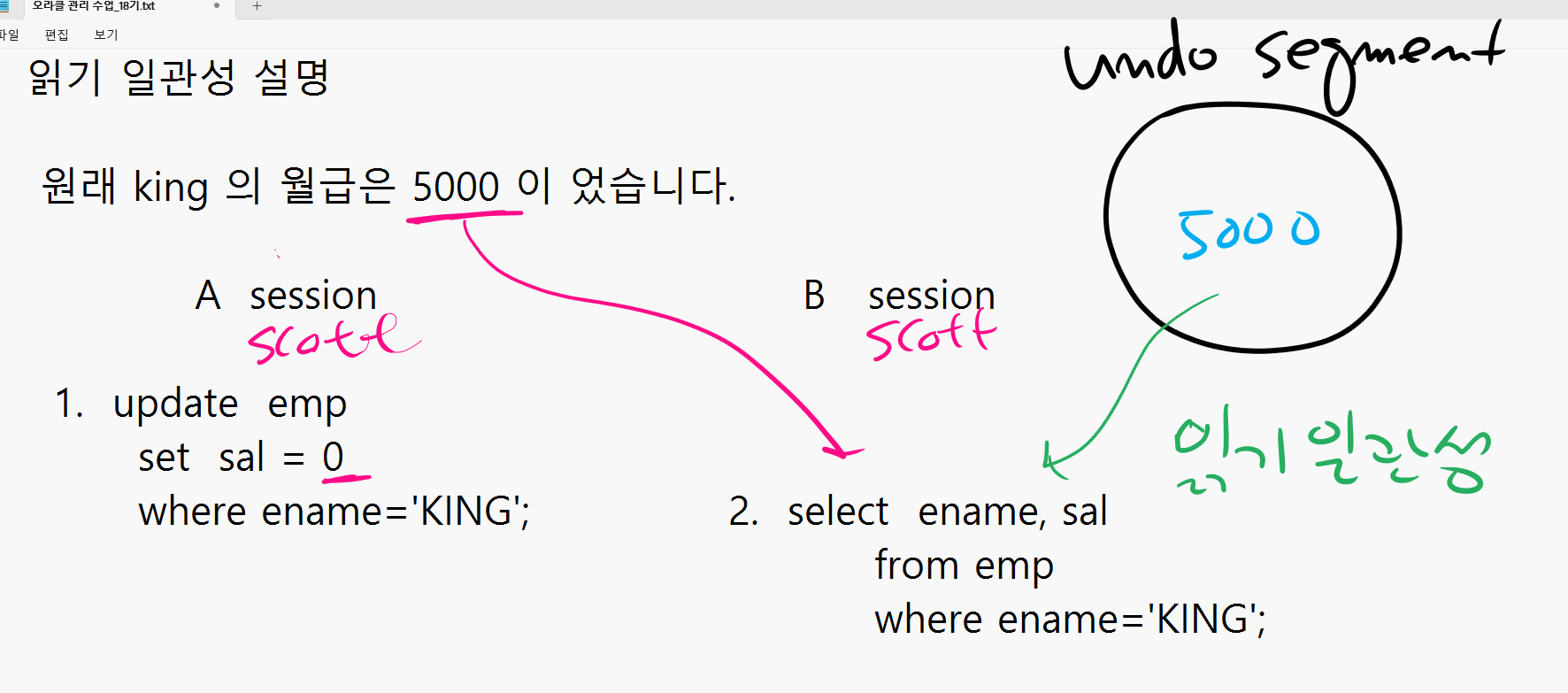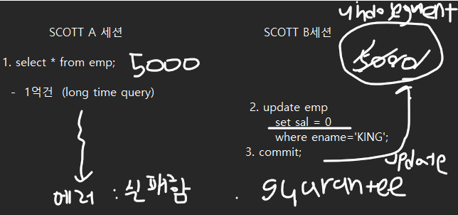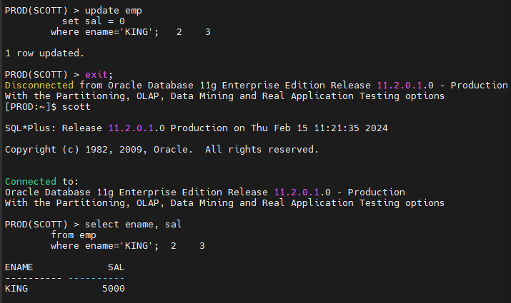 A 세션 COMMIT 전, B 세션에서 KING 의 SAL 은 5000 으로 select 된다.