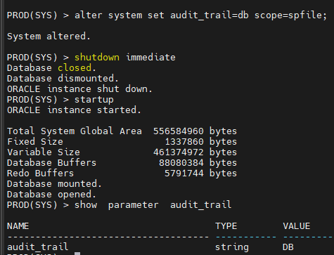 PROD(SYS) > alter system set audit_trail=db scope=spfile;
