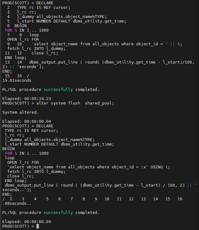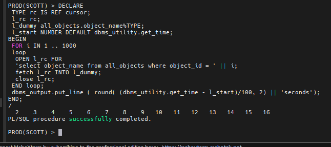 문제6. 아까 26초 넘게 수행되었던 리터럴 sql 을 1000번 수행하는 PL/SQL 을 수행해보시오 !