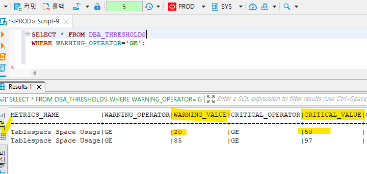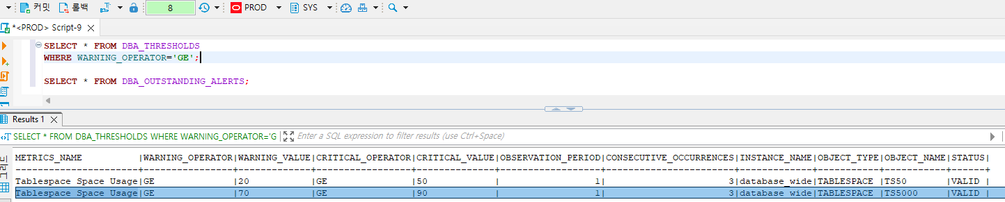 테이블 스페이스에 대해서 조정한 임계치 확인하는 쿼리문 :