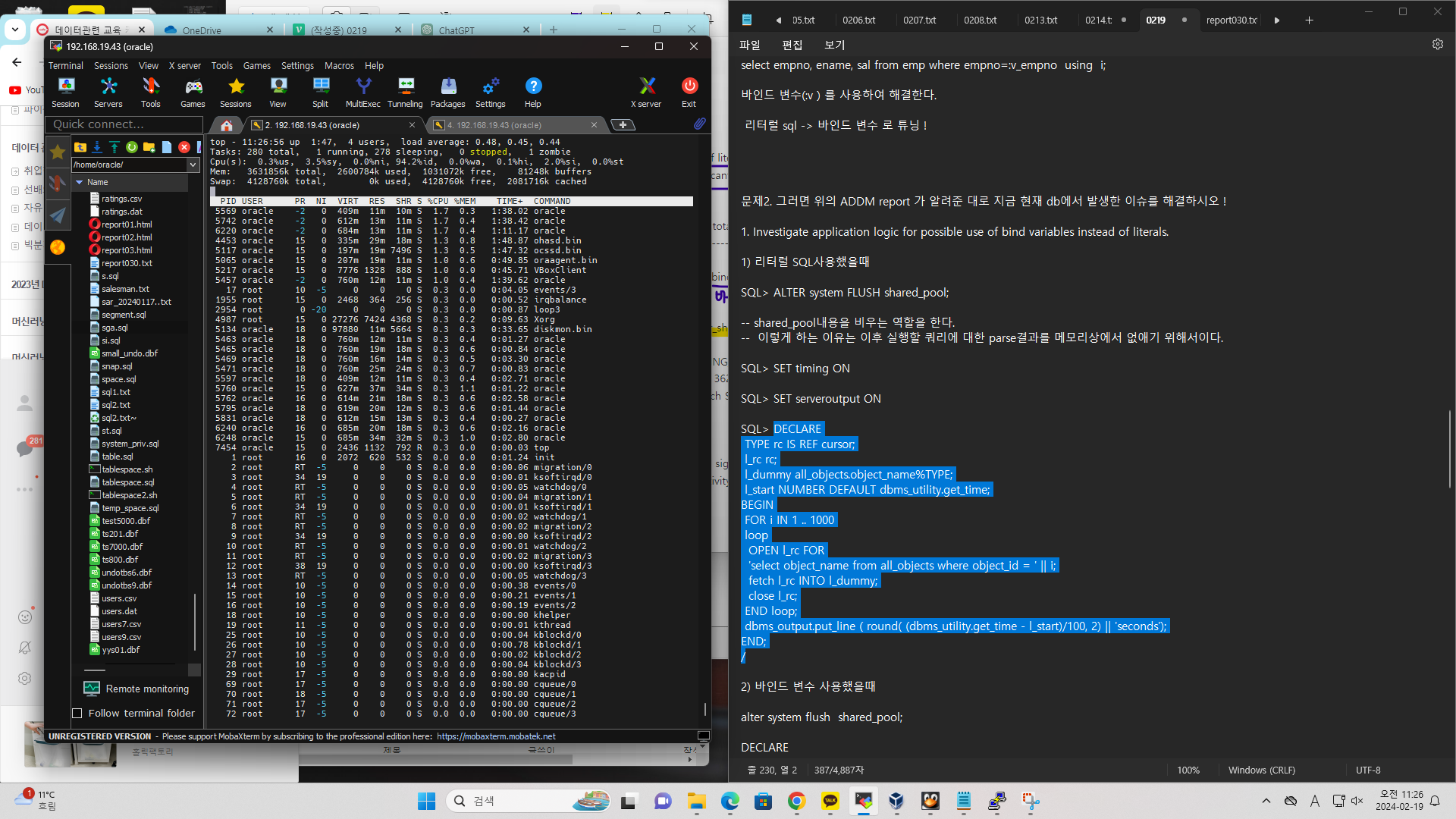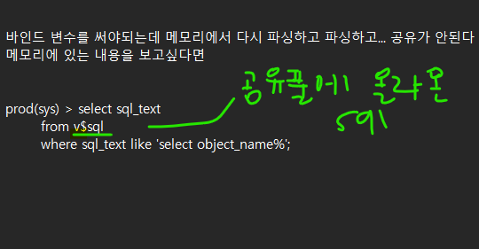 바인드 변수를 써야되는데 메모리에서 다시 파싱하고 파싱하고... 공유가 안된다 ... ? 이게 무슨말이에요