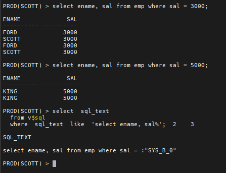 문제5. 여러분들이 직접 리터럴 SQL 을 2개 작성해서 실행하고 오라클이 알아서 바인드 변수로 변경했는지 확인해보세요