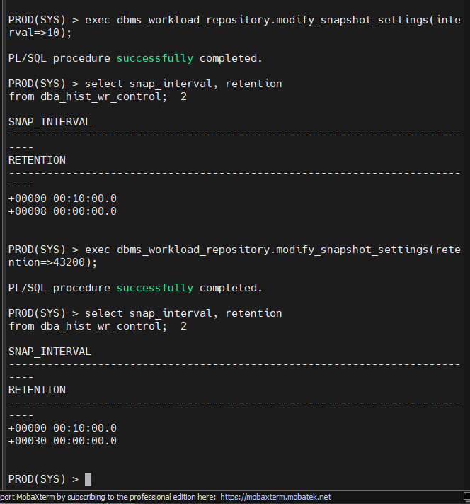 PROD(SYS) > exec dbms_workload_repository.create_snapshot;