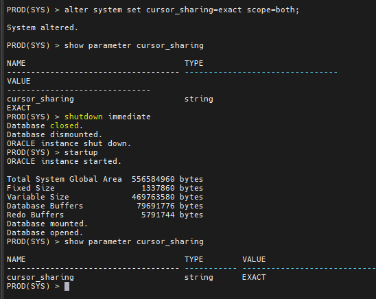 문제7. 그럼 다시 cursor_sharing 파라미터를 exact 로 변경하고 디비를 내렸다 올리세요