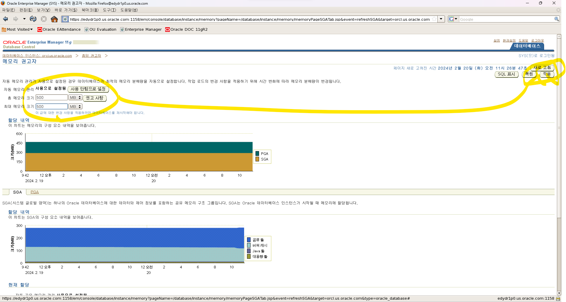 주: Maximum Memory Size를 변경하는 경우에는 데이터베이스 Instance를