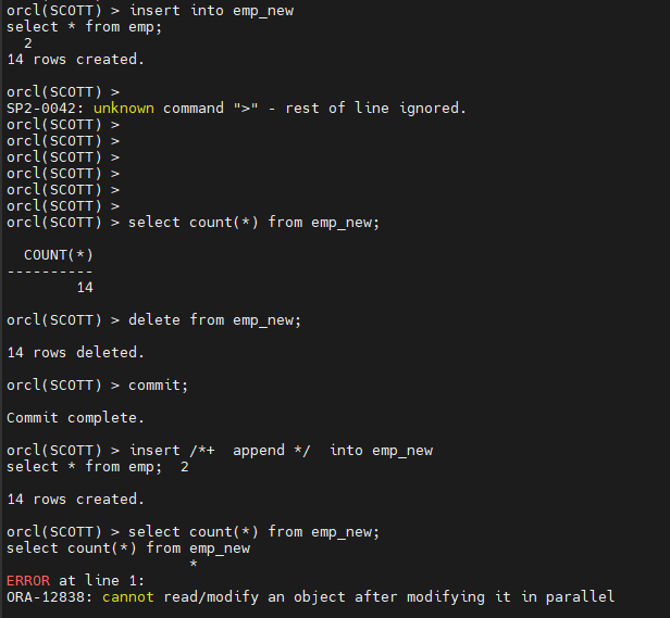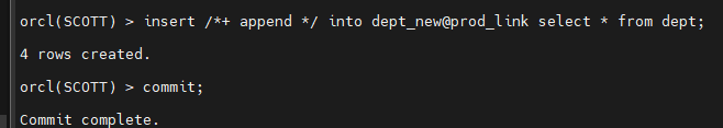 orcl(SCOTT) > insert /+ append / into dept_new@prod_link select * from dept;