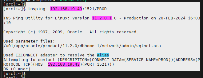 [orcl:~]$ tnsping 192.168.19.43:1521/PROD