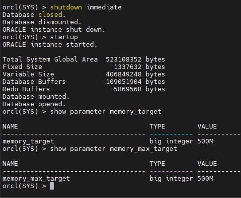 orcl(SYS) > alter system set memory_max_target=500m scope=spfile;